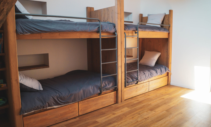 La troisième chambre a été pensée comme un dortoir. Elle dispose de grands rangements accueillant livres, jeux et jouets. Avec ses 4 lits superposés en bois massif (faits sur mesure par un menuisier local), il y a comme un air de montagne en Seine et Marne.